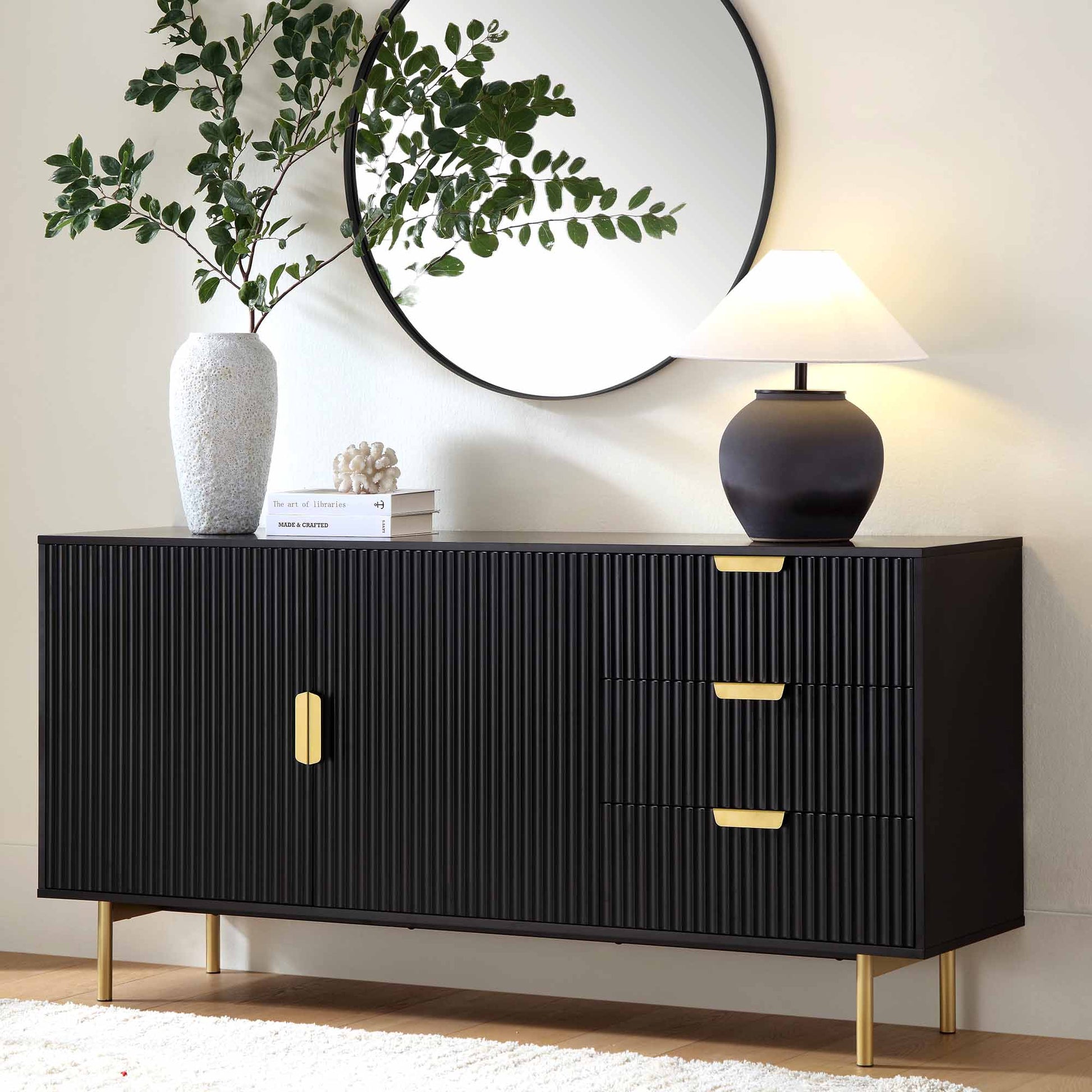 - Le buffet présente une surface de porte striée finie en peinture noire mate, associée à des poignées et des pieds dorés.