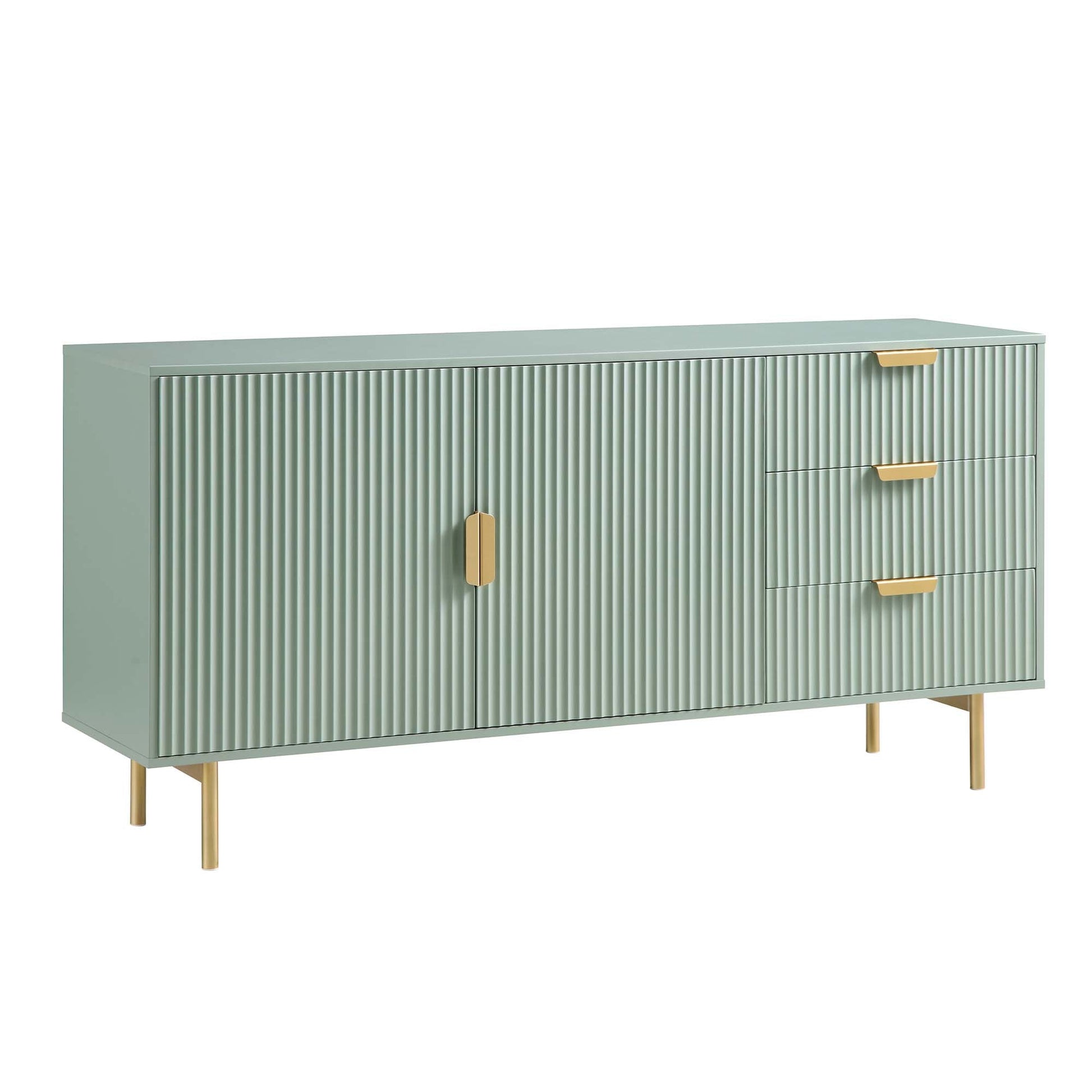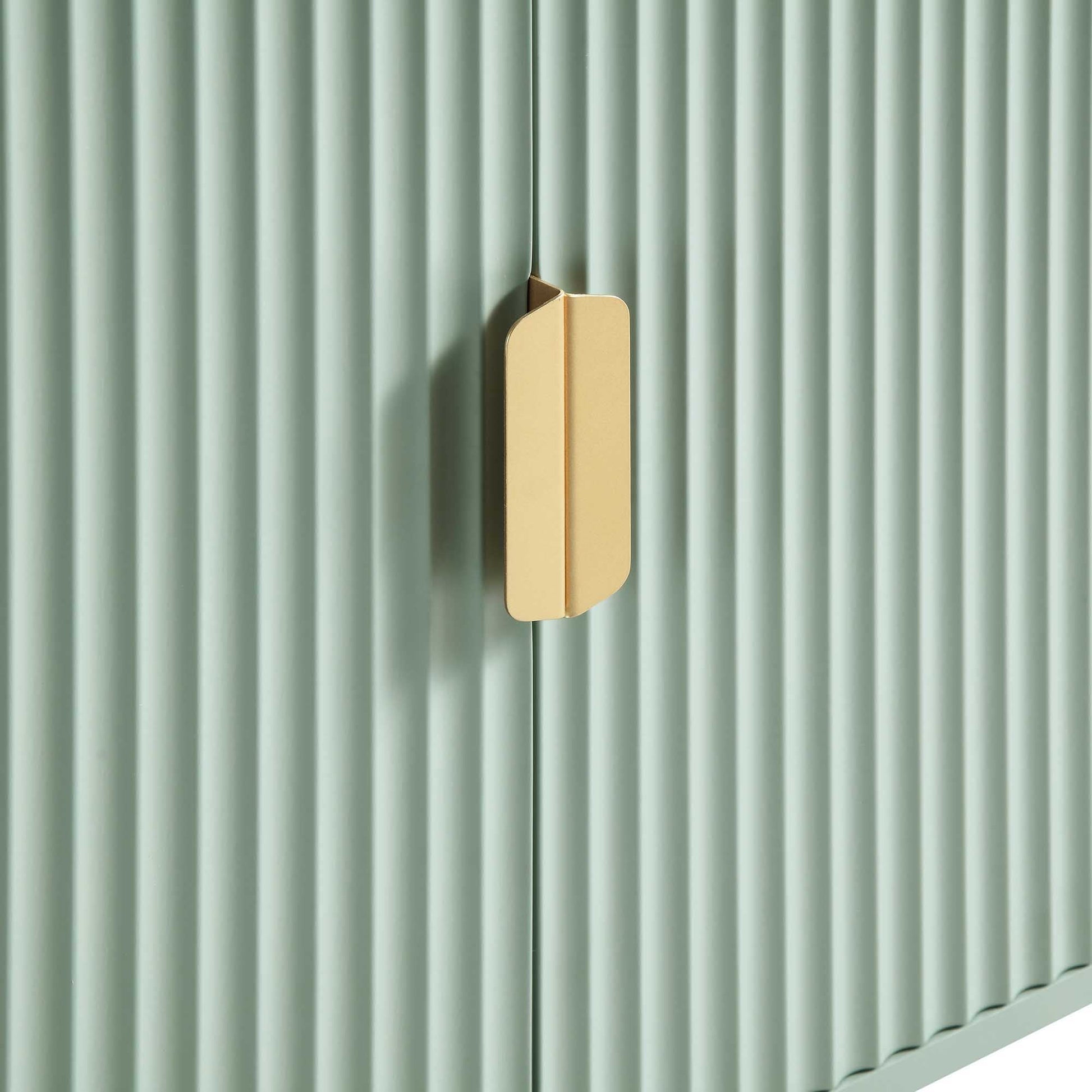 - Le buffet présente une surface de porte striée finie en peinture vert sauge mate, associée à des poignées et des pieds dorés.