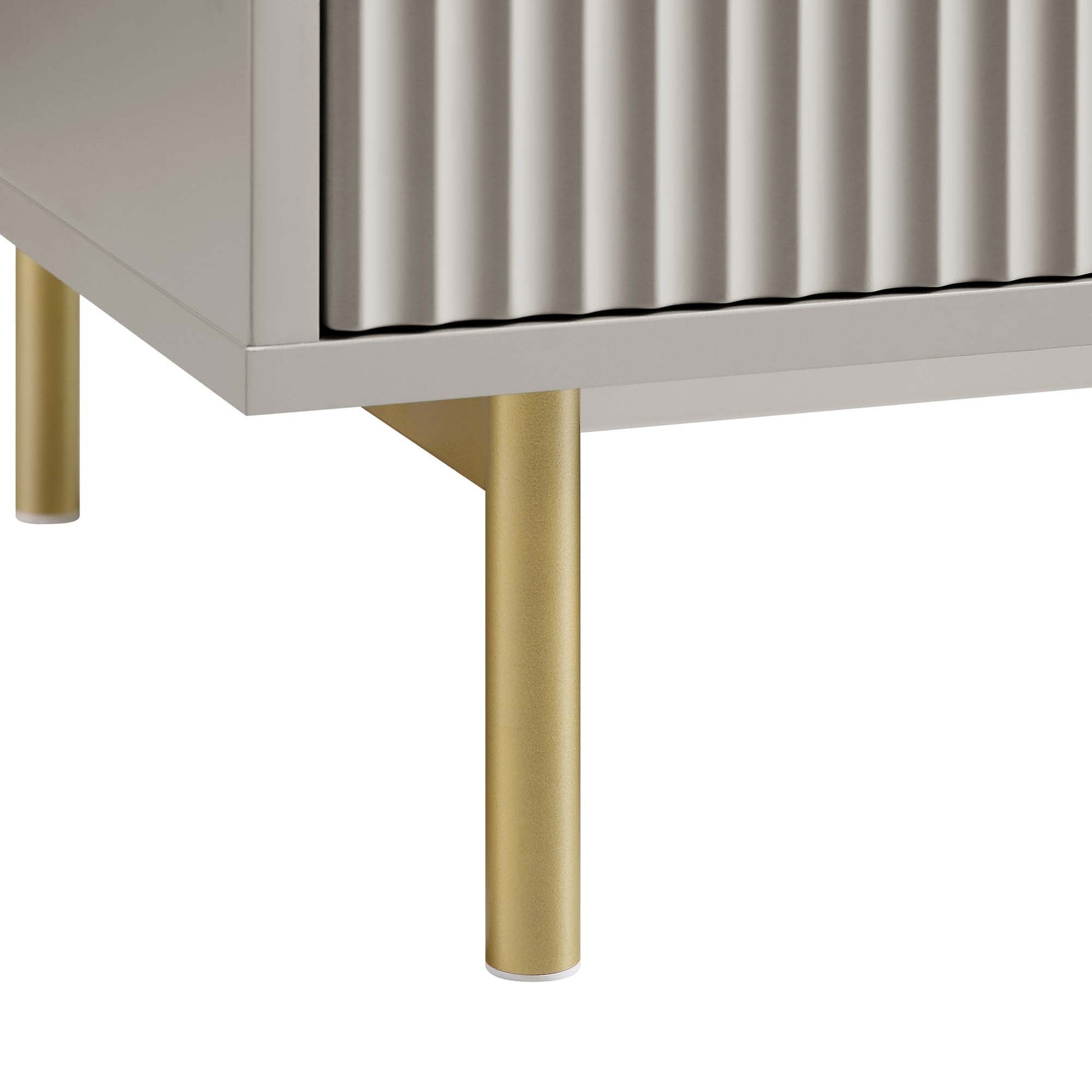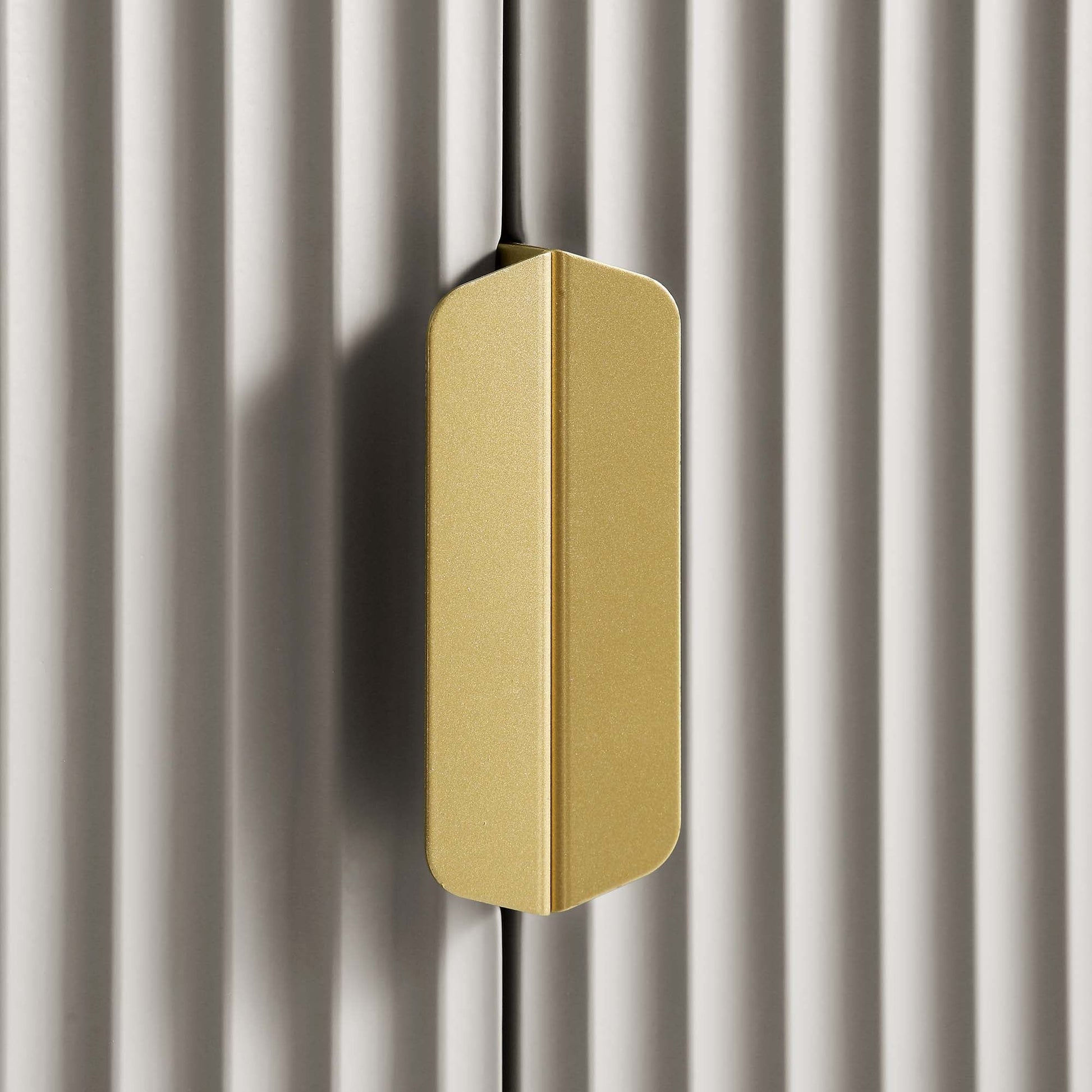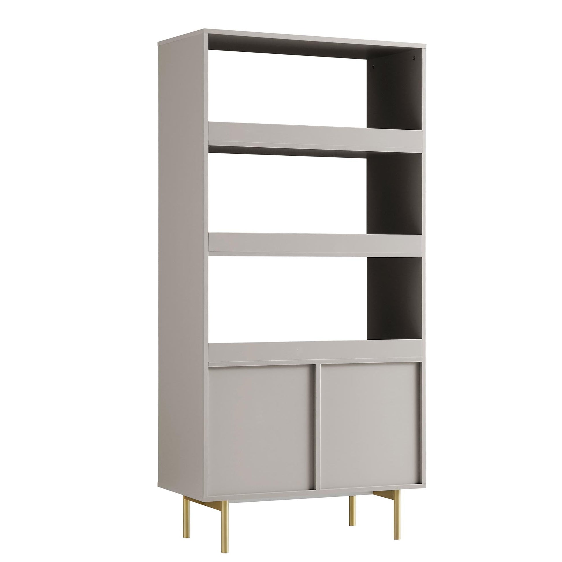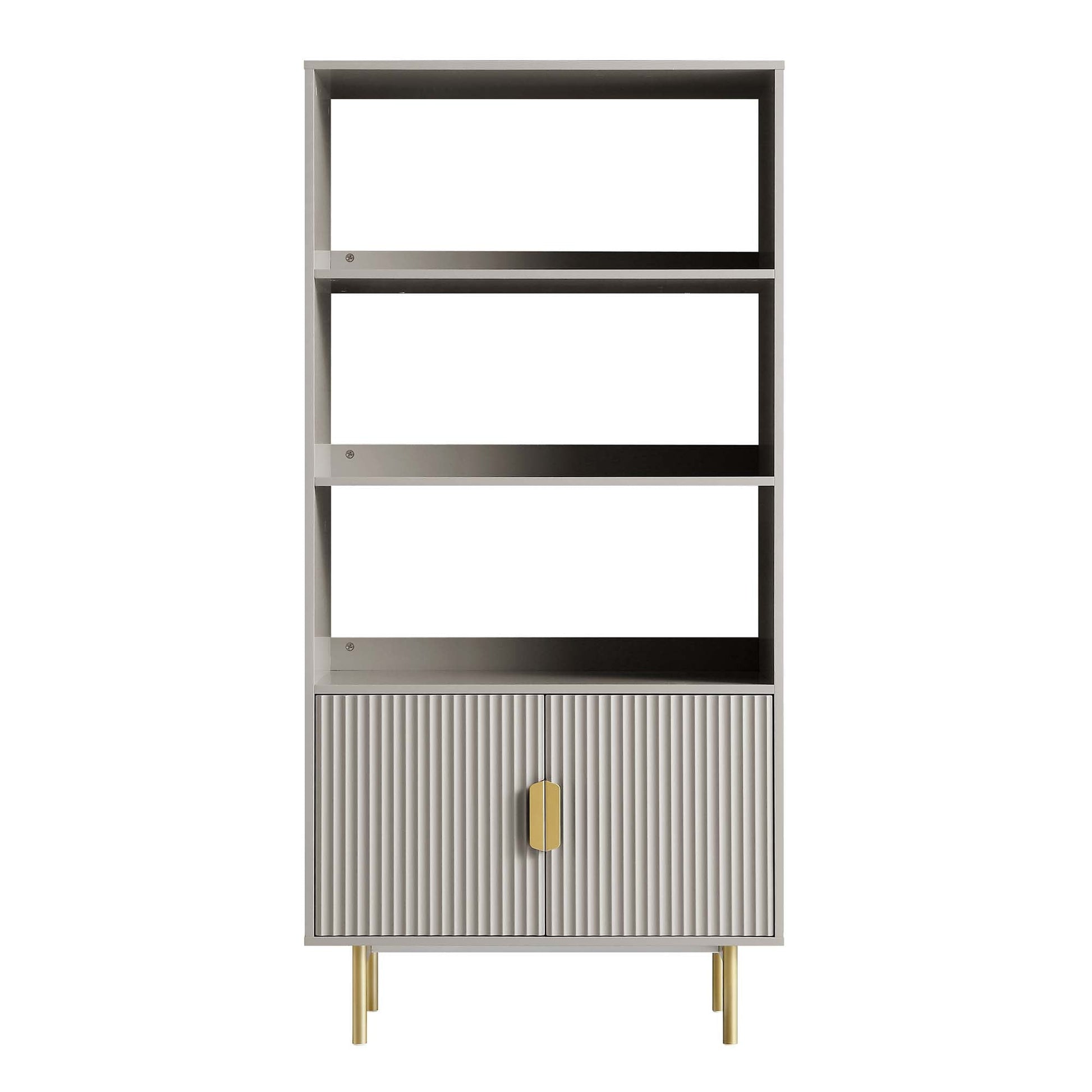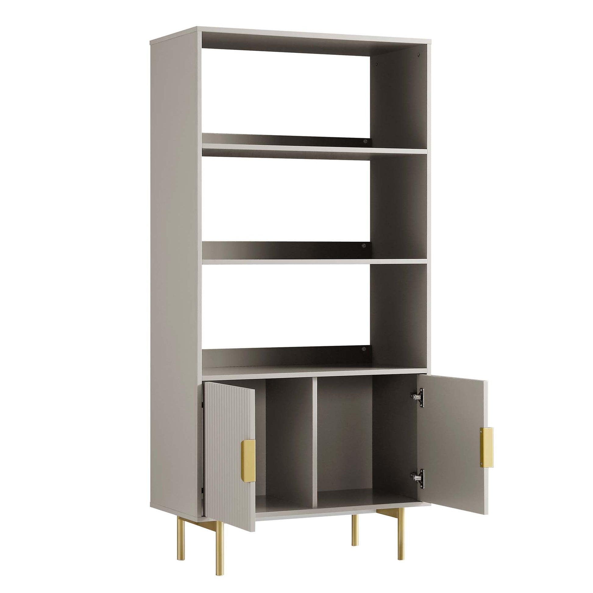 - La bibliothèque présente une surface de porte striée finie en peinture taupe mate, associée à des poignées dorées sur les portes et des pieds assortis.