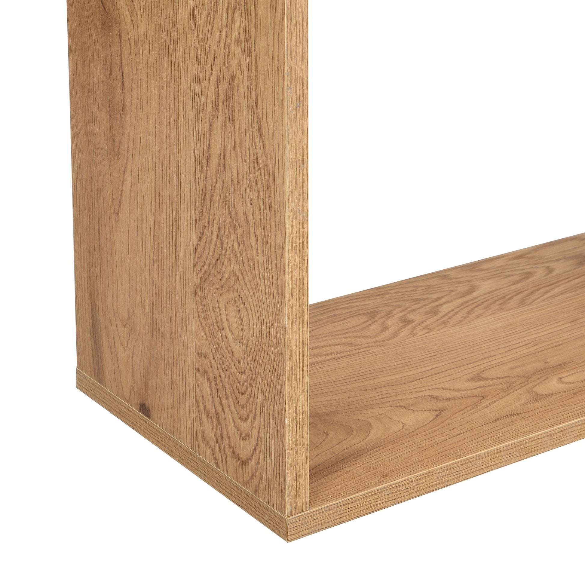 - L'étagère large effet chêne lisse offre 8 cellules de différentes tailles pour le rangement.