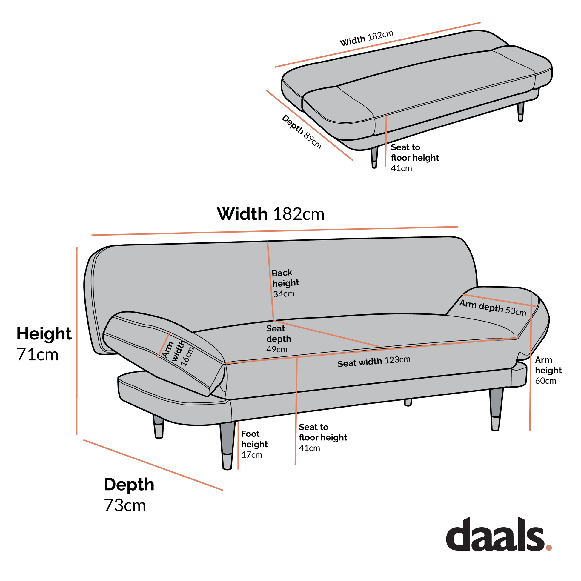 - Dimensions du canapé : L 182 x P 73 x H 71 cm