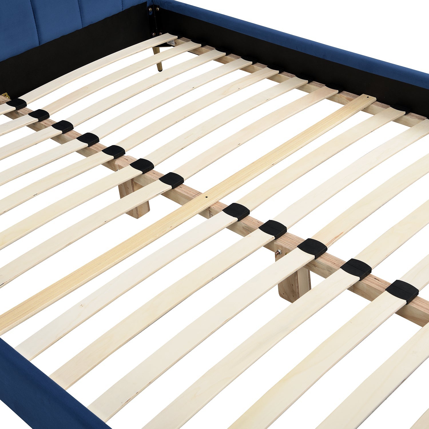 Cadre de lit rembourré en velours Sylvie avec pieds chromés dorés, velours bleu marine