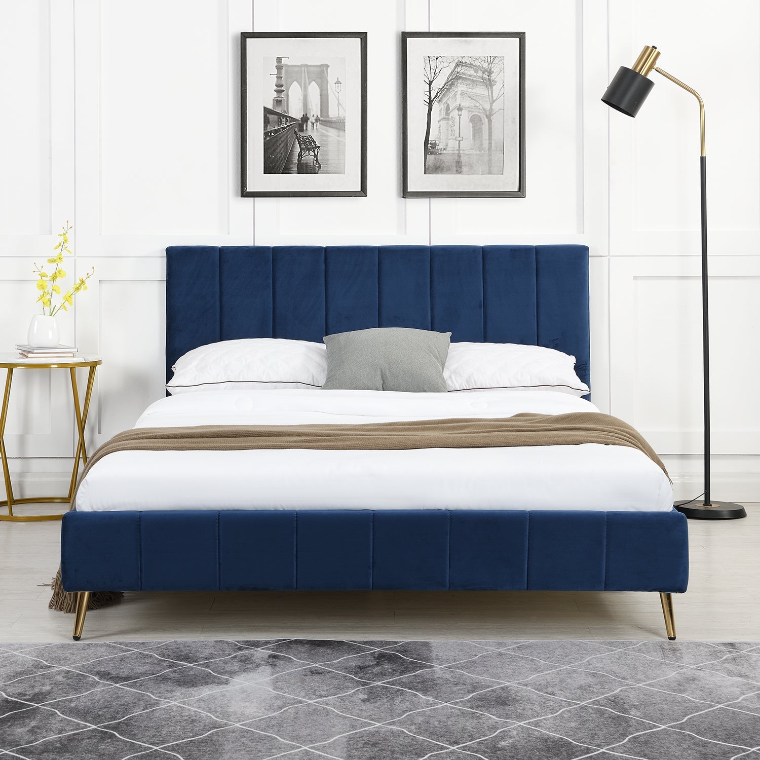 - Le cadre de lit est doté d'une tête de lit cannelée, associée à des pieds en métal de couleur dorée pour un look moderne.