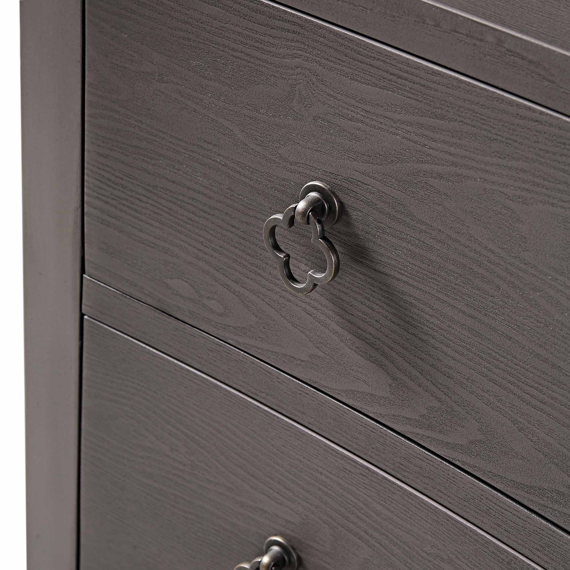 - Les façades de tiroirs légèrement concaves sont complétées par des poignées en métal en laiton vieilli en forme de clou de girofle.