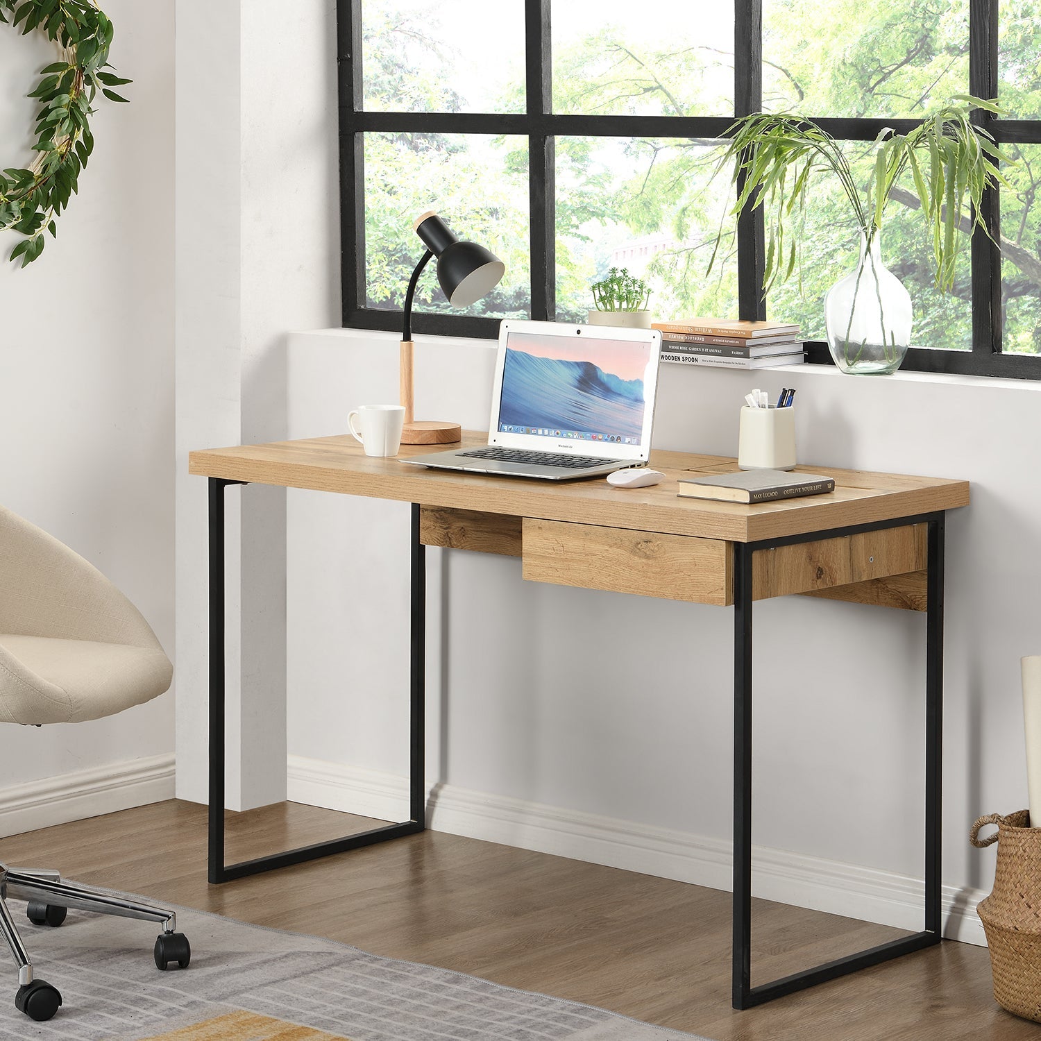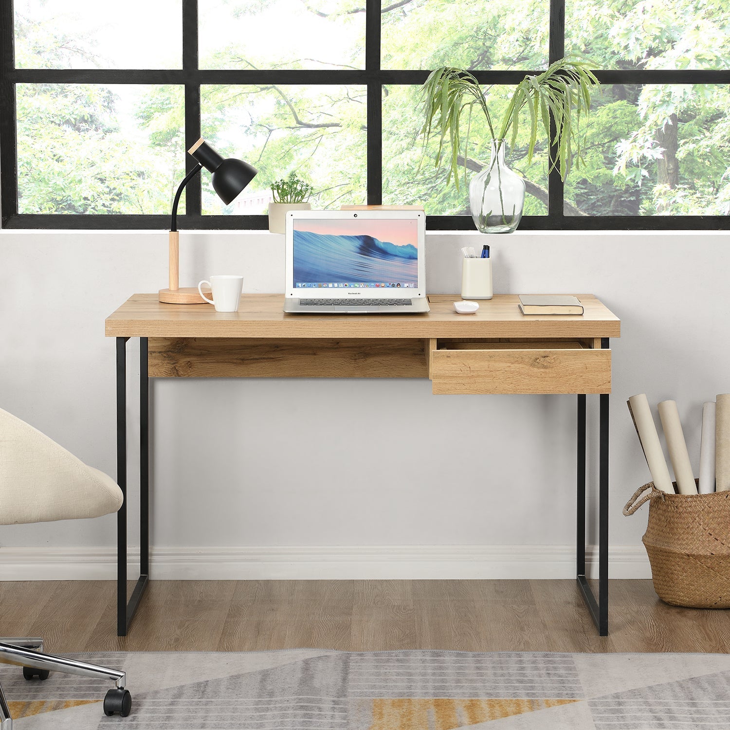 - Le bureau est doté d'un plateau effet chêne, de pieds en métal industriel, d'un tiroir coulissant et d'un espace de rangement dissimulé pour la gestion des câbles.