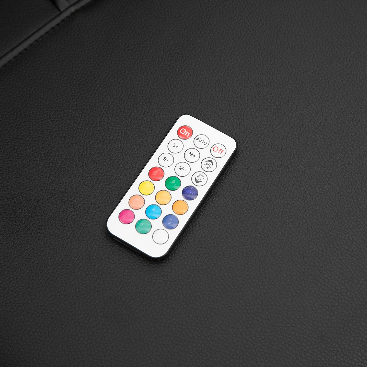 - Lumière d'ambiance LED entièrement personnalisable grâce à une télécommande pratique dissimulée sur le côté du siège. Optez pour un thème multicolore ou monochrome, selon vos envies. Remarque : la lumière LED est alimentée par une batterie externe (non fournie) via un câble USB. Celle-ci se glisse facilement dans la poche située au dos du fauteuil. L'alimentation minimale est de 5 V et 2 A.