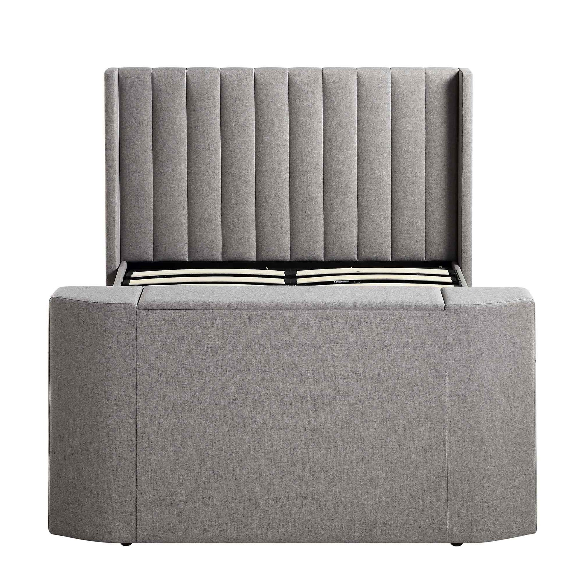 - Complétez le look : sur la photo avec notre lit TV ottoman en tissu gris Wilton, nous trouvons notre table de chevet concave à 3 tiroirs Thalia en chêne argenté , notre tapis en jute tressé à la main Aurora bleu sarcelle et bronze et notre coussin brodé à la main Japonica de la collection Vine.