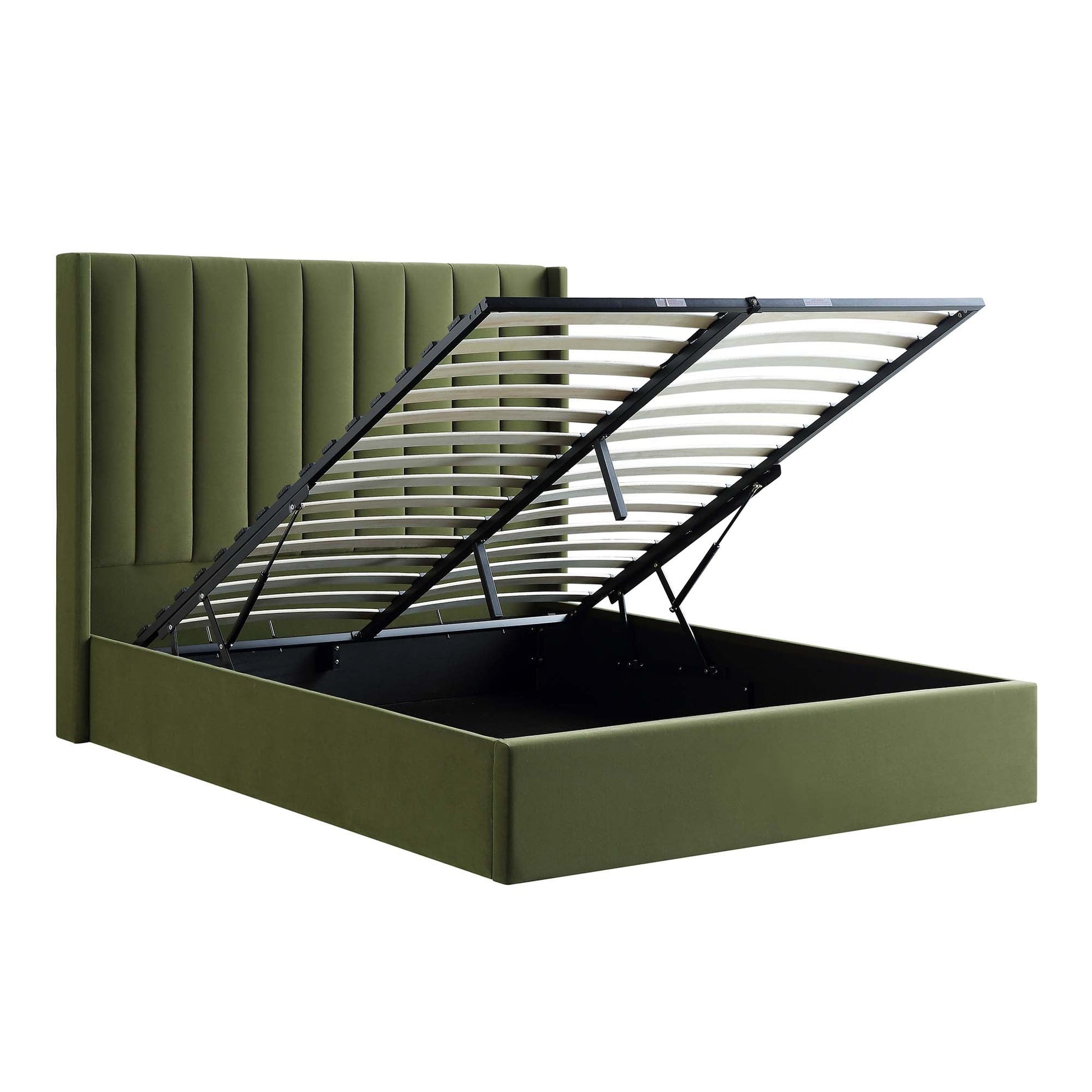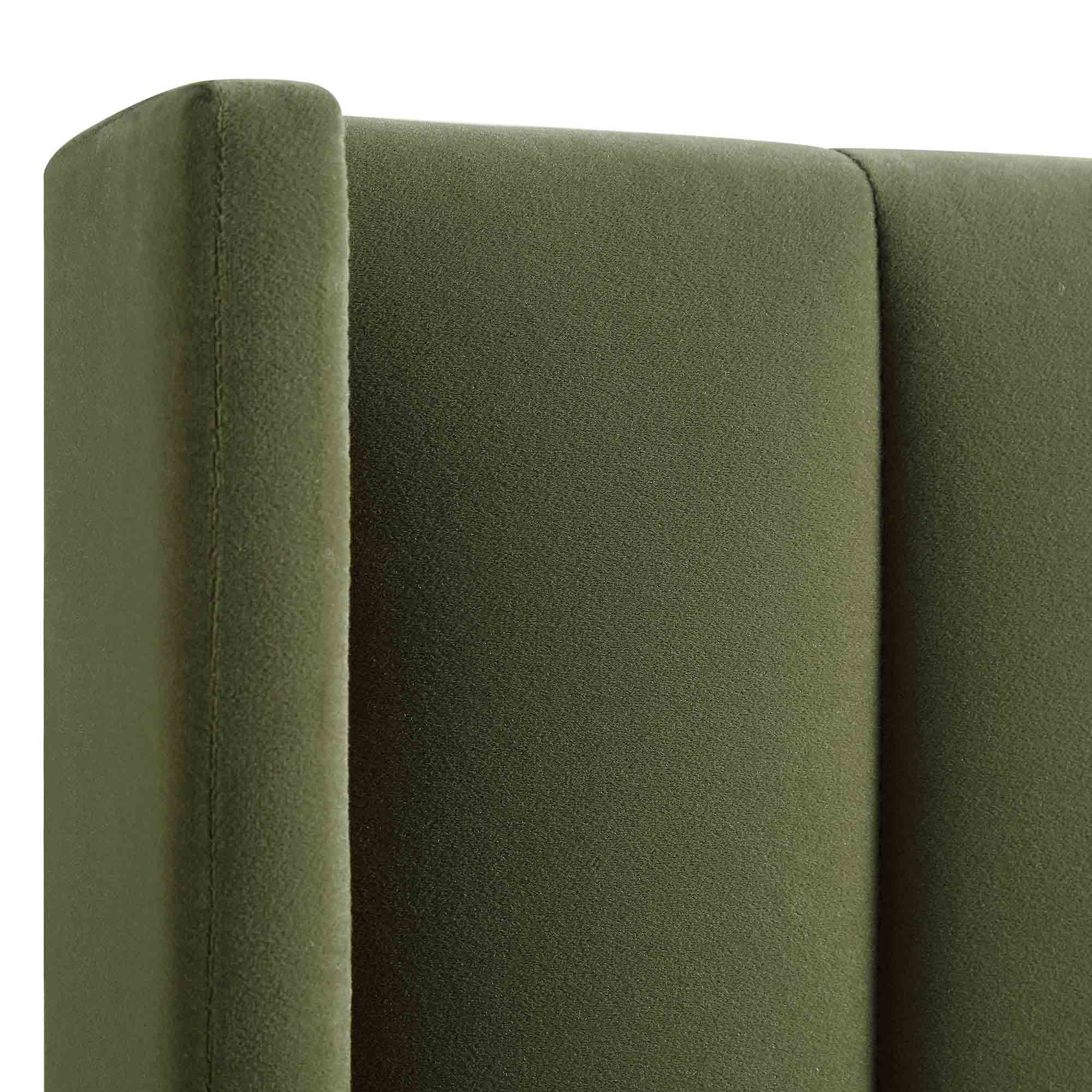 - La tête de lit rembourrée avec capitonnage vertical complète le somptueux revêtement en velours vert mousse.